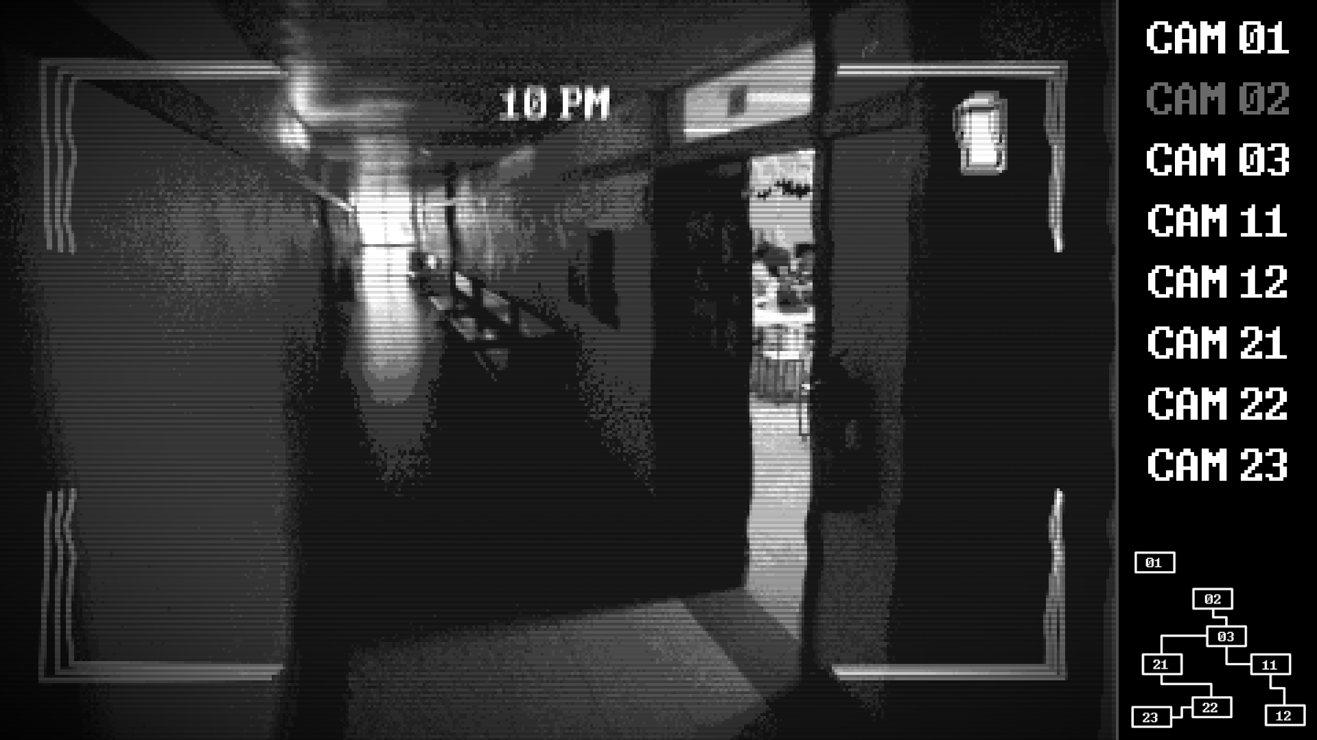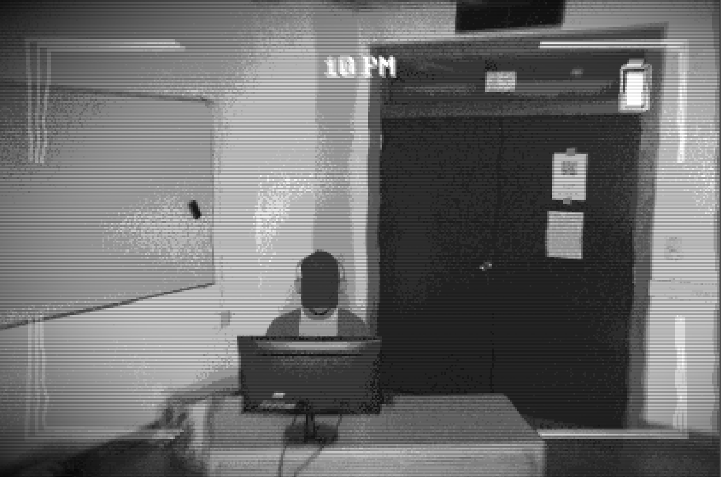 The game follows a security guard that has to keep a group of people participating in a game jam safe from the monsters that haunt the place. The player, controlling the security guard, has to cycle through the various security cams spread throughout the building in search of said monsters, and to keep them away, each security cam has a flashlight mode, and a ultra-low frequency mode, but thesee modes take too much energy, and the security system has limited battery. Each monster is affected by a different mode, some avoid light, some are averse to sounds, some need both.